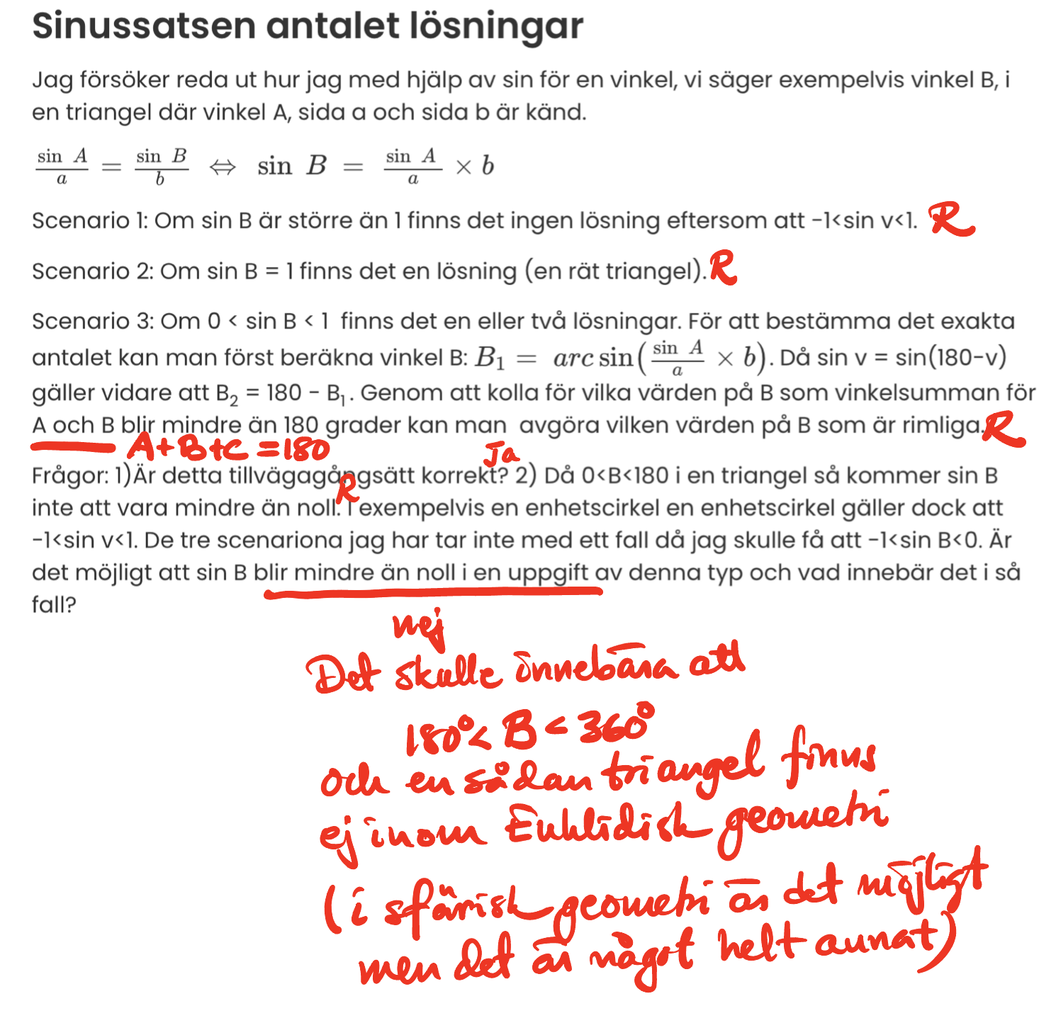 Frågor: 1)Är detta tillvägagångsätt korrekt? 2) Då 0<B<180 i en triangel så kommer sin B inte att vara mindre än noll. I exempelvis en enhetscirkel en enhetscirkel gäller dock att -1<sin v<1. De tre scenariona jag har tar inte med ett fall då jag skulle få att -1<sin B<0. Är det möjligt att sin B blir mindre än noll i en uppgift av denna typ och vad innebär det i så fall?