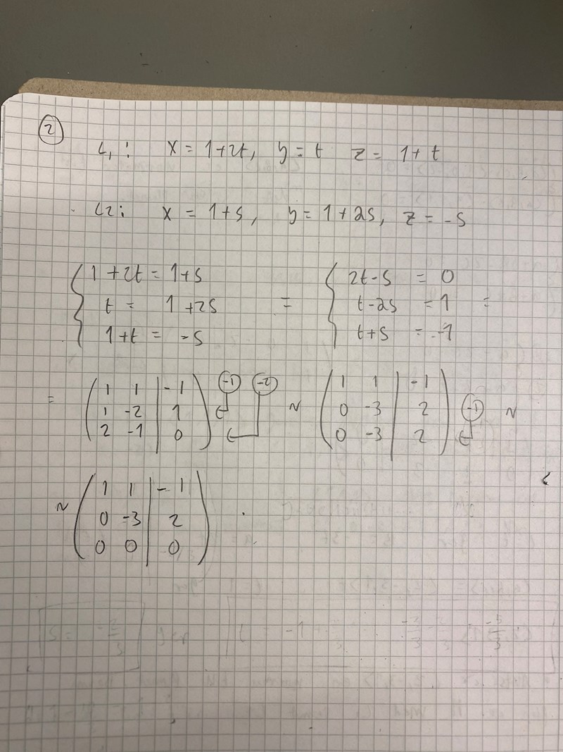 Redan efter att du adderat subtraherat rad 1 från rad 2 så får du att -3s = 2. Lös ut t och kontrollera att detta ger samma punkt på båda linjerna.