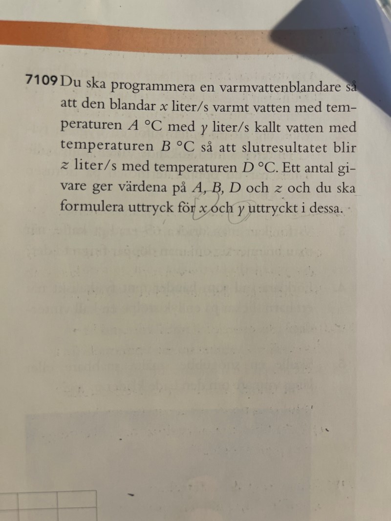Tänk dig att den energin som tillförs genom det kalla och varma vattnet ska vara lika med den som bortförs i det blandade vattnet.