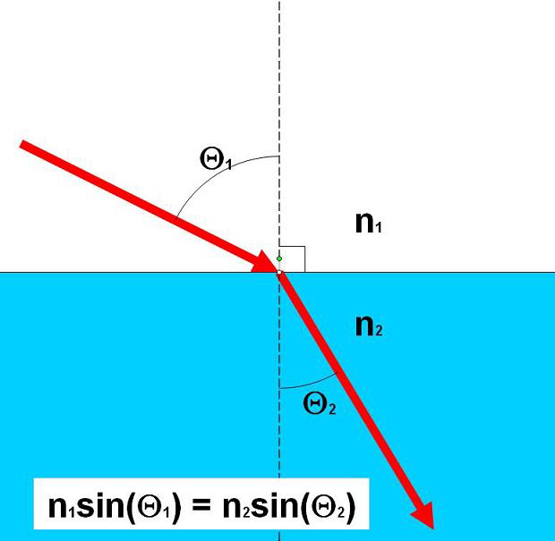 där n är brytningsindexen, som såvitt jag förstått är hur snabbt ljus färdas i olika medium.