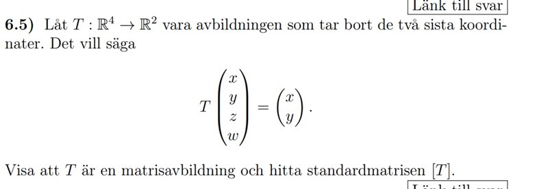 2) När jag ska hitta standard matrisen för den här avbildningen kan jag då tänka att jag ska skala om de olika elementen hos vektorn, alltså att x ska ha 1, y 1 och z w 0?