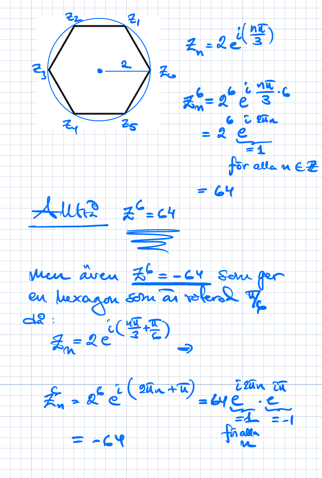 Det finns oändligt många ekvationer, men uppgiften frågade efter 2 exempel. Alla hexagoner, men en vinkelförskjutning funkar. Vi bara väljer 0 och 30° för det ger snygga ekvationer.