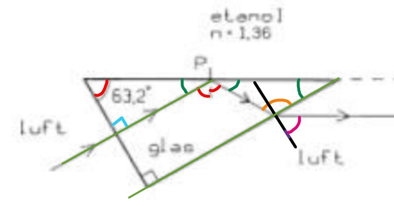 Detta kan dock inte vara rätt eftersom infallsvinkeln enligt facit ska vara 36,4°. Är dessutom lite osäker på hur man vet om strålen lämnar prismat parallellt med gränsytan mot etanolen! I facit står det att det inte finns ett sådant värde, men jag förstår inte varför.