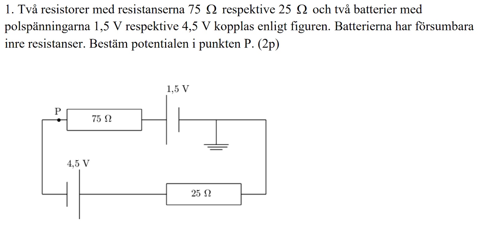 Alltså "bryta upp kretsen" i mindre delar och låtsas som att de är slutna kretser (förutsatt att det är en seriekopplad likström då). - Hur påverkar jordningar Ohms lag? I mitt huvud så tänker jag att batteriet med 1,5V som har en minuspol närmast gör att något måste adderas så att det kan bli 0V vid jordningen, men vad? Om man följer batteriernas poler borde resistorn med 25 Ω ha en plus- minuspol eftersom det är motstånd.