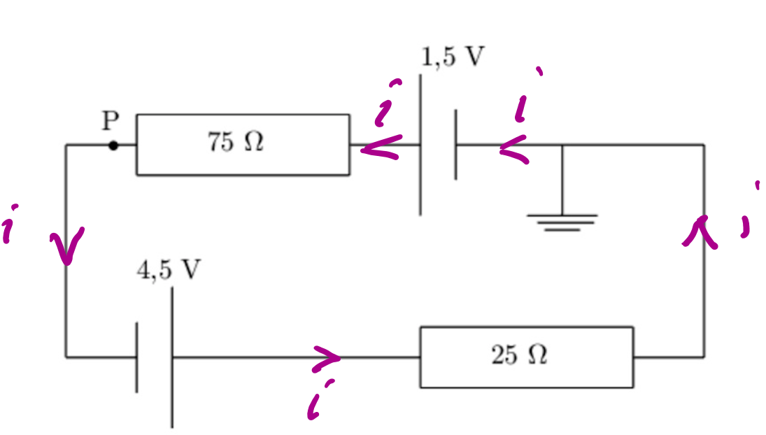 När jag försöker få reda på strömmen i kretsloppet som jag skickade överst så blev den röda delen 0,02 A och den blåa 0,06 A. Går jag vidare och tar 4,5 V genom 25 Ω så blev det 0,018 A och sist så om jag tog 1,5 genom 25 så blev det 0,06 A. Jag ser ju att det blir samma storlek på ström när jag tog 4,5/75 och 1,5/25, men jag förstår liksom inte vad det andra betyder. Jag liksom tappar bort mig och blir dessutom förvirrad av jordningen.