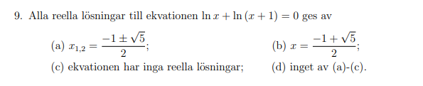 oggih skrev:1) Du kan nog utgå från att man på MaFy-provet använder de definitioner som man normalt sett lär sig på gymnasiet, vilket i det här fallet innebär att ln(x) bara är definierat för positiva reella tal x.