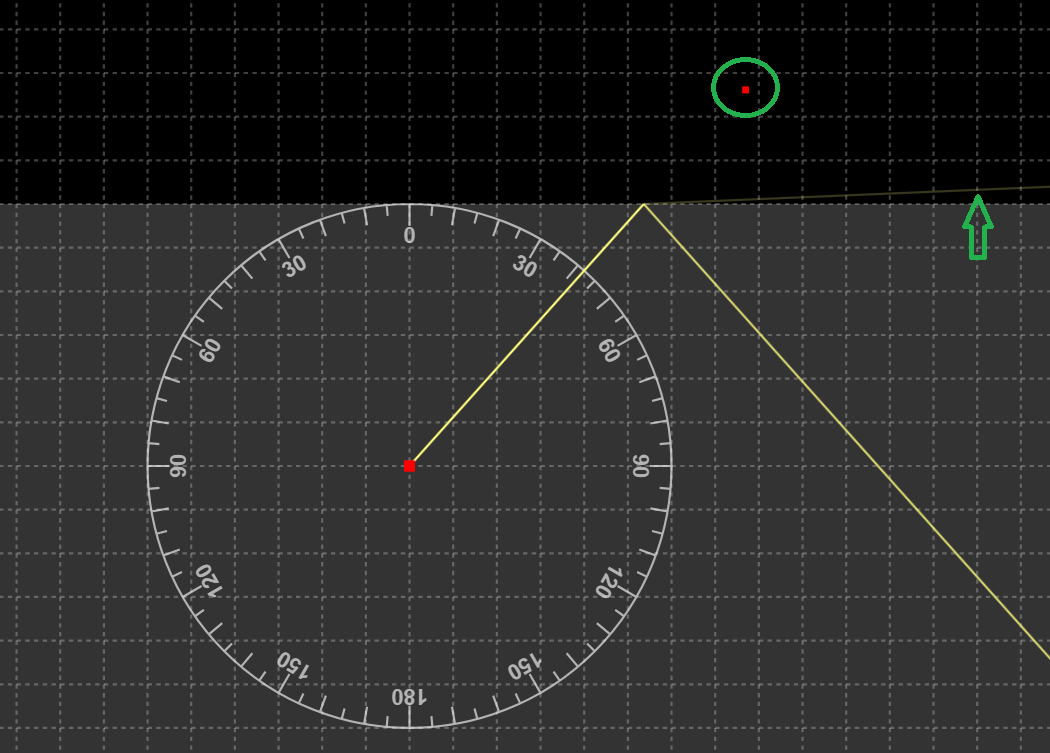 ah, vänta nu hänger jag med på vad du menar. Men ljusstrålen går inte längs med gränsytan förrän den hamnar som jag har gjort i simulatorn. Om jag skulle placera lasern sådär så blir det fortfarande en totalreflektion som u ugglans steg fyra och inte som i steg tre, som jag försöker återskapa. Lasern måste i det fallet vara i 90 grader mot normalen för att brytningsvinkeln ska bli på det viset som i ugglans steg 3.