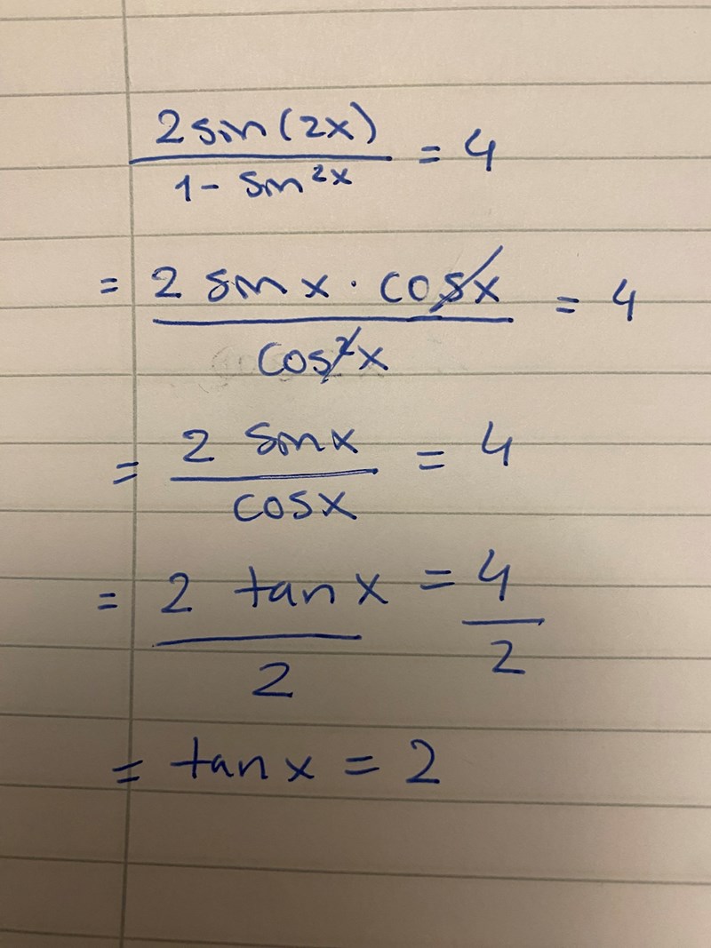 Du glömde 2'an i formeln för sin 2x = 2 sinx cos x. Du får alltså 4 sin x cos x i täljaren.