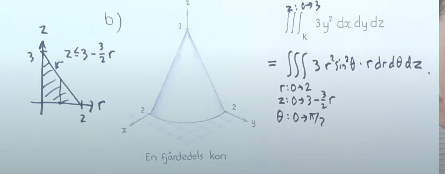 Deluppgiften va att ändra till cylindriska kordinater. Jag gjorde såhär 0<r<-2/3z+2 , 0 <theta <pi/2 och 0< z<3, Jag ser dock inte hur ordningen drd0dz skulle fungera då integralen län st ut inte ska innehålla några variabler för lösningen i bilden.