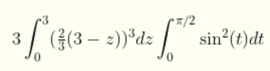 3 INT_0^3 (2/3(3-z))^3 dz INT_0^{π/2} sin(t)^2 dt = 9π/2