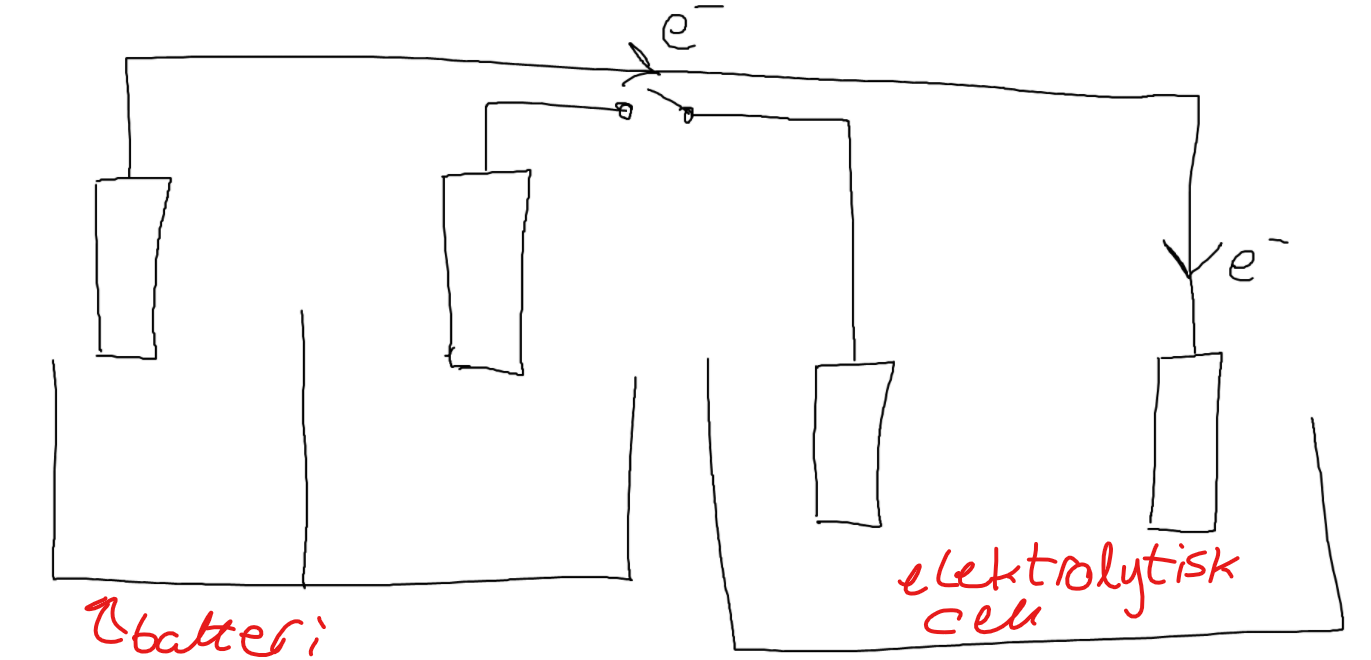 Det jag försökte rita upp var det allmäna fallet av hur man driver en elektrolytisk cell med ett batteri men det kanske inte var så allmänt som jag trodde...? Jag utgick från den här bilden där man gjorde typ smältelektrolys, alltså med inerta elektroder i elektrolyscellen: