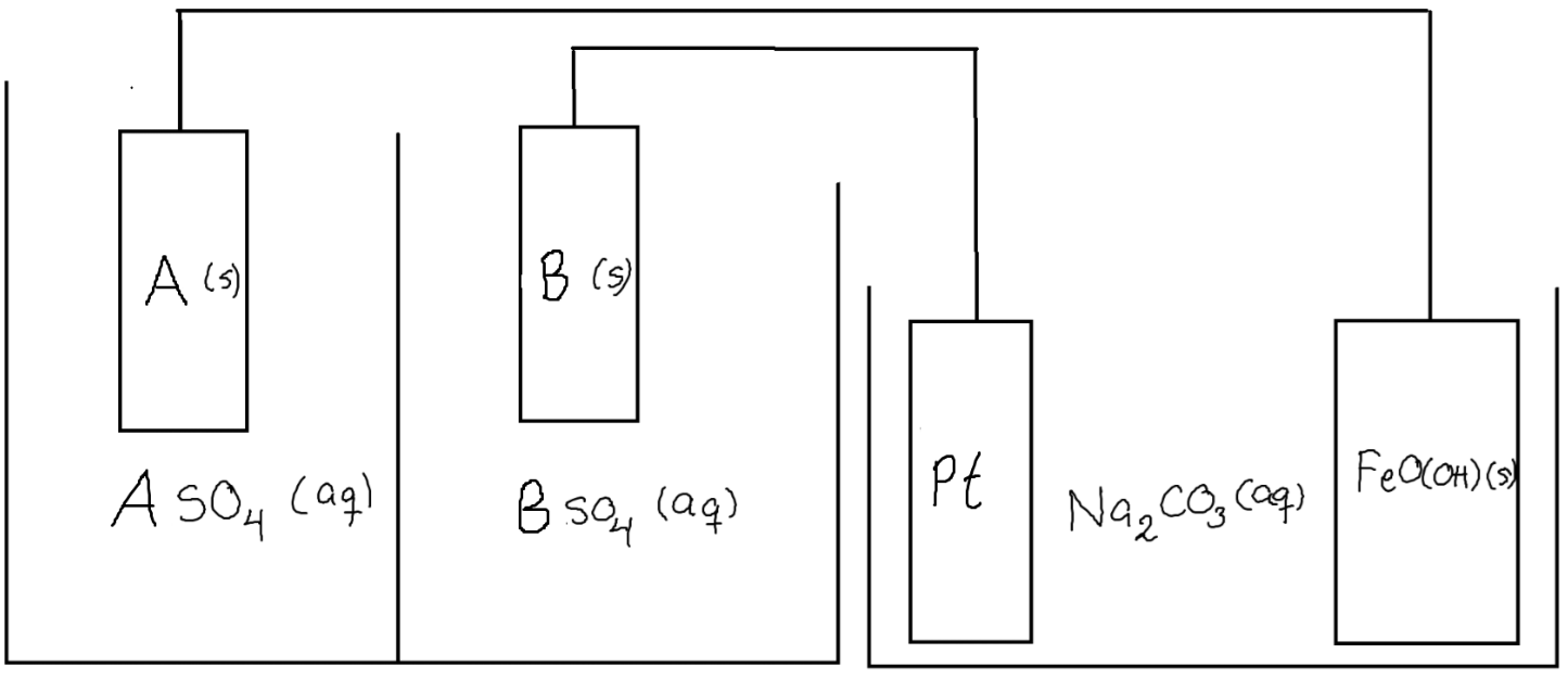 Men varför ska man räkna på mellan A/B och FeO(OH)/Pt? Kanske är det så att det är mellan dessa reaktionerna sker "netto", men om man analyserar systemet så sker väl reaktionerna egentligen mellan A/FeO(OH) och B/Pt, alltså enligt hur de sitter ihop?