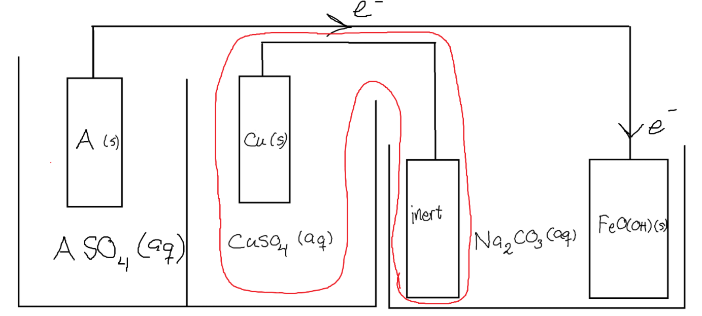 Du får ingen sluten krets utan det inringade området, det bildas ett överskott av positiv laddning längst till vänster i form av A2+(aq), dessa hindrar fler elektroner från att vandra och reducera FeOOH. T.ex. skulle sulfatjoner från CuSO4(aq) kunna vandra åt vänster för att motverka detta, men då har du ett överskott av positiv laddning vid kopparelektroden istället. Detta motverkas genom en reduktion där Cu2+(aq) tar upp elektroner som avges av den "inerta" elektroden.