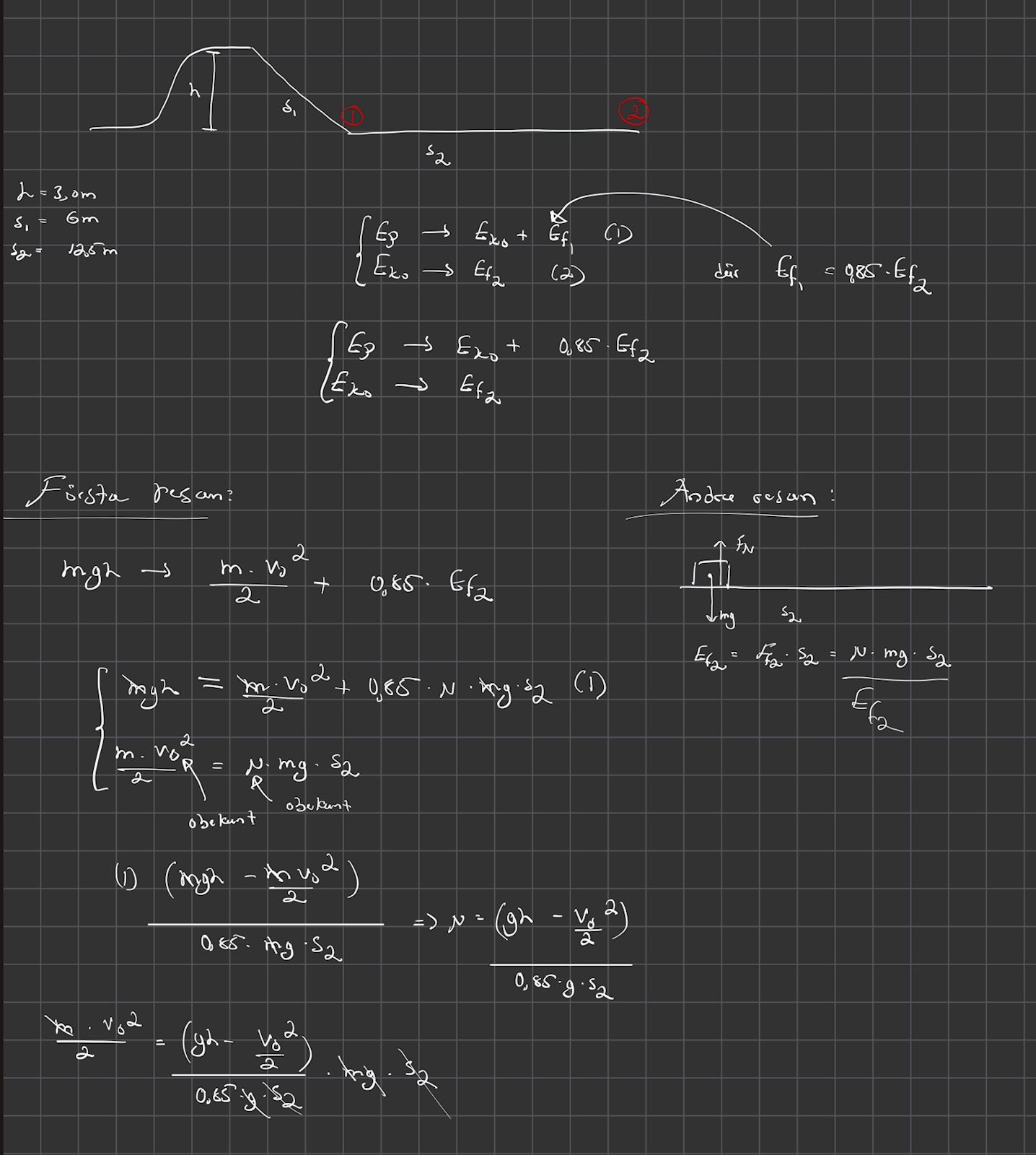 Okej, tror att jag förstår nu! Men om friktionskraften är 085 % lägre i backen, borde det ändå inte bli samma ekvation. F1 = friktionsarbetet i backen = 0,85*F2.