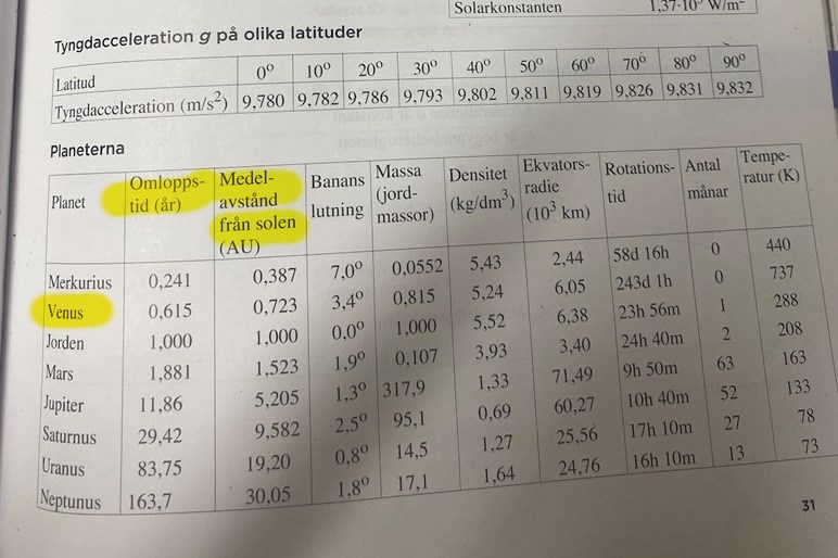Hitta relevanta värden i en tabell för att beräkna Venus fart runt solen.