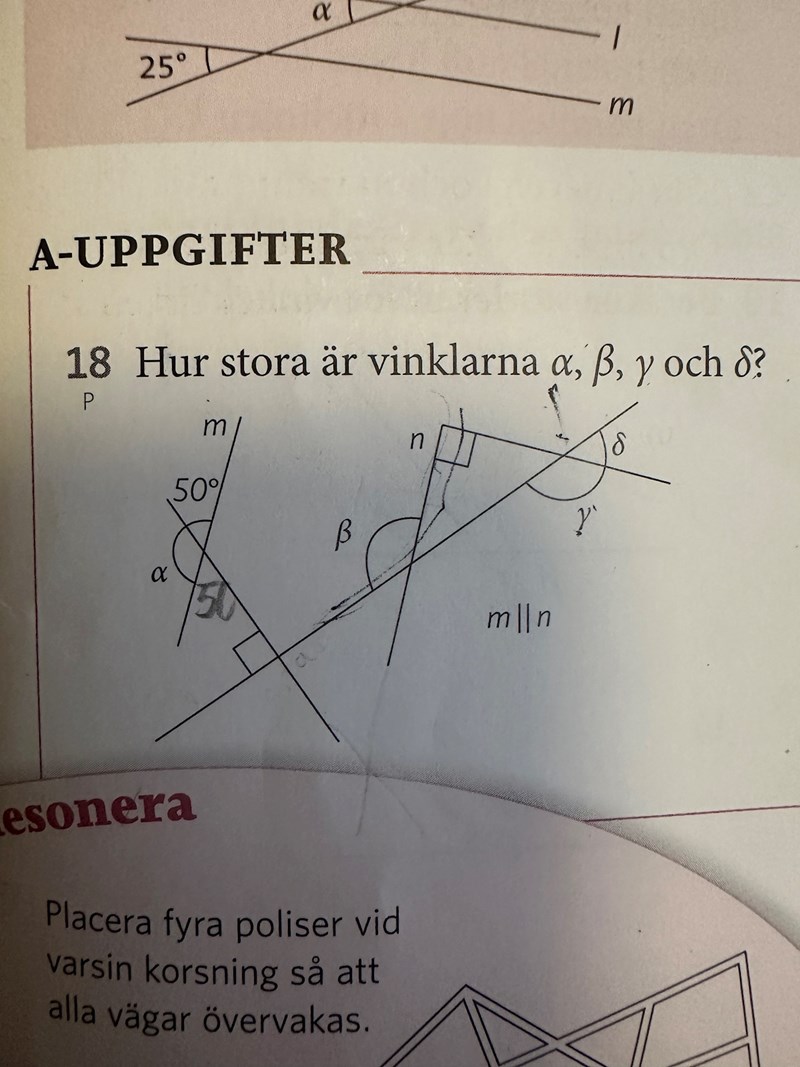 Använd sedan att linjerna m och n är parallella. Förläng m så att den skär nästa linje,