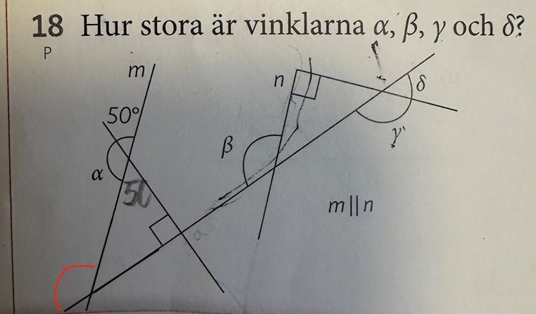 Vinklarna som visas av gul stjärna är 90 - 50 = 40