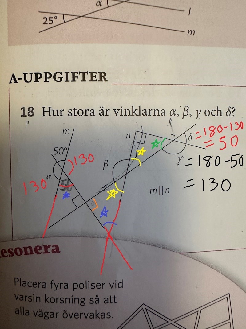 Vinklarna som visas av blå stjärnor är samma, dvs 180 - 130 = 50