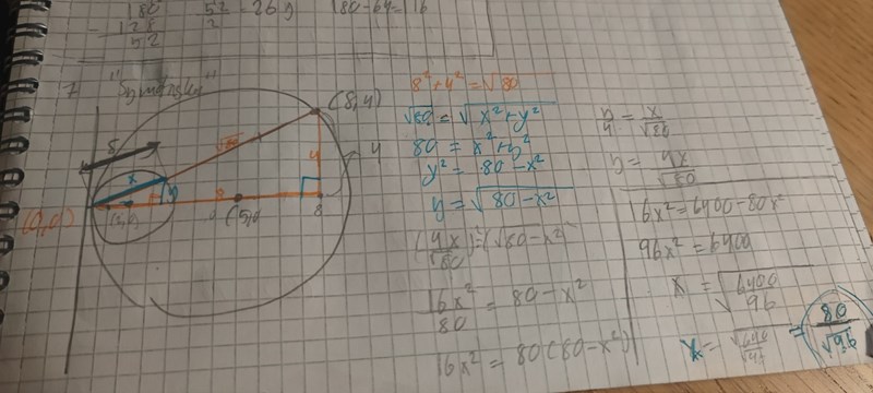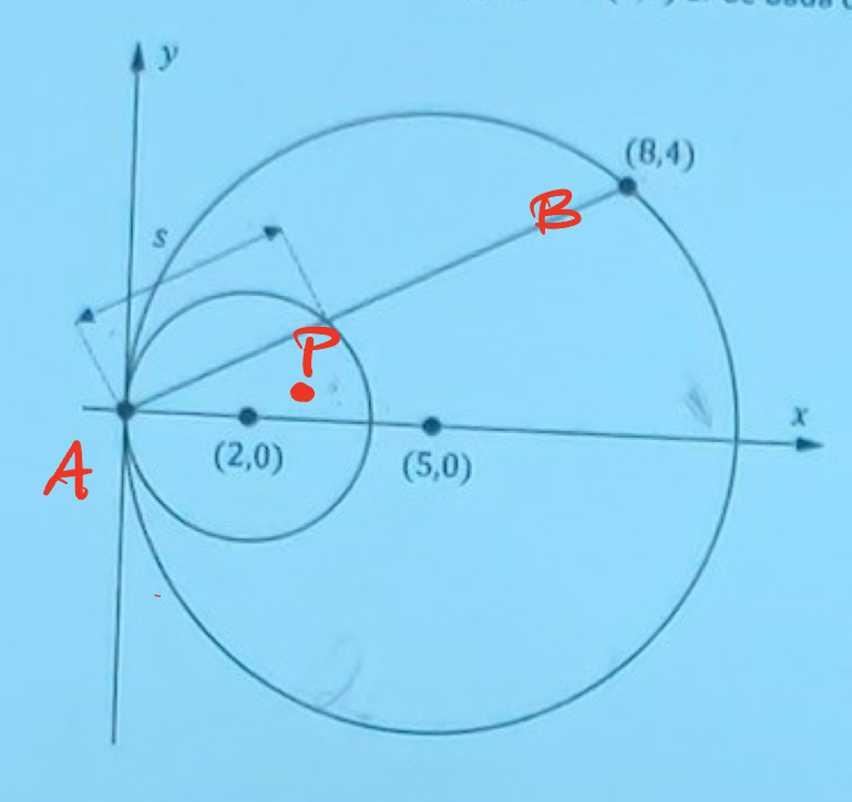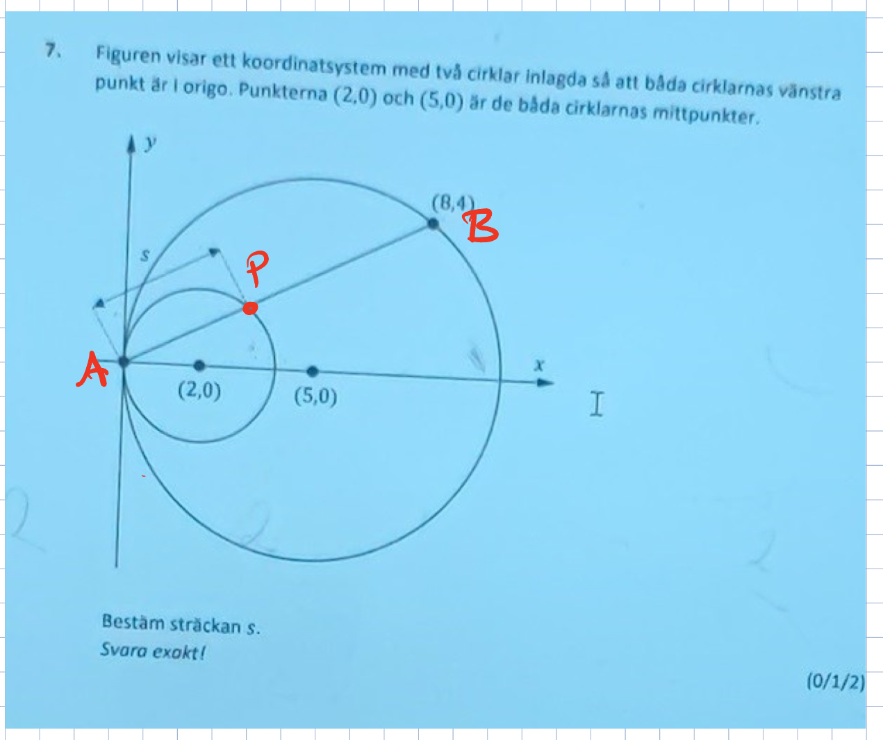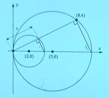 Du har ju räknat ut längden på (0,0) till (8,4). Den lilla cirkeln med sin sträcka s och den stora cirkeln med den förlängda s-linjen är likformiga med ett förhållande som framgår av radierna.