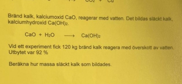 Hur många mol bränd kalk var det som reagerade? Hur många mol släckt kalk skulle ha bildats, om utbytet hade varit 100 %? Nu var utbytet bara 92 %. Hur många mol släckt kalk bildades? Vad hade denna kalk för massa?