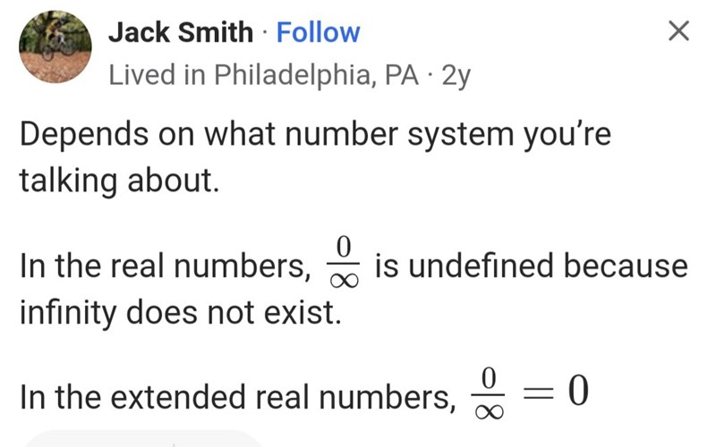 Jag håller med om att gränsvärdet för 0/x går mot 0 så att man kan nog säga att 0/=0 medan gränsvärdet för /0 inte är definierat. Men i "IEEE-aritmetik" (om du matar in det i ett beräkningsprogram) så blir svaret Inf, dvs , så det är inte helt klart vad som gäller.