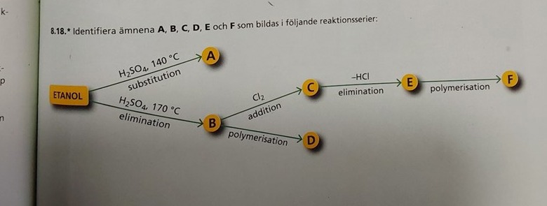 Man får olika produkter för olika reaktioner sen man ska köra produkterna igen genom en annan reaktion. Vid C, det blir 1,2-dikloretan som man ska eliminera HCL ifrån