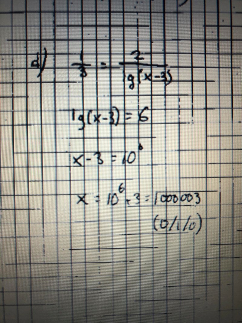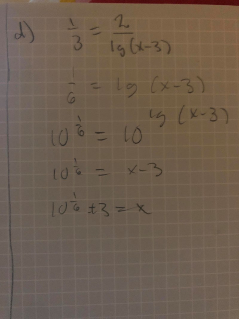 Nej precis man måste inte multiplicera med 1/2 på både sidorna, jag trodde det var det du hade gjort på bilden då du skrev 1/6 på vänstra ledet. Det finns många sätt att lösa detta på men krossmultiplicering är väldigt effektivt, vad man egentligen gör då är att man multiplicerar exempelvis 3 på båda sidorna vilket betyder att på VL: 3*(1/3)=1 och sedan på HL: 3*(2/lg(x-3))=6/lg(x-3). Så nu har vi 1=6/lg(x-3). Nu kan vi istället multiplicera lg(x-3) på båda sidorna vilket ger: lg(x-3)=6. Detta funkar eftersom att vilket tal som helst delat med sig självt alltid blir 1, ex: lg(x-3)/lg(x-3)=1, 9/9=1, pi/pi=1 osv. Det du gjort nu stämmer perfect, nu vill vi bli av med hela "lg" grejen, lg är en förkortning av log_10 eller logaritm med basen 10, och för att bli av med den så kan man höja upp båda ledena med 10, dvs 10^(VL) och 10^(HL), då tar de ut varandra och då får du kvar (x-3)=10^6.