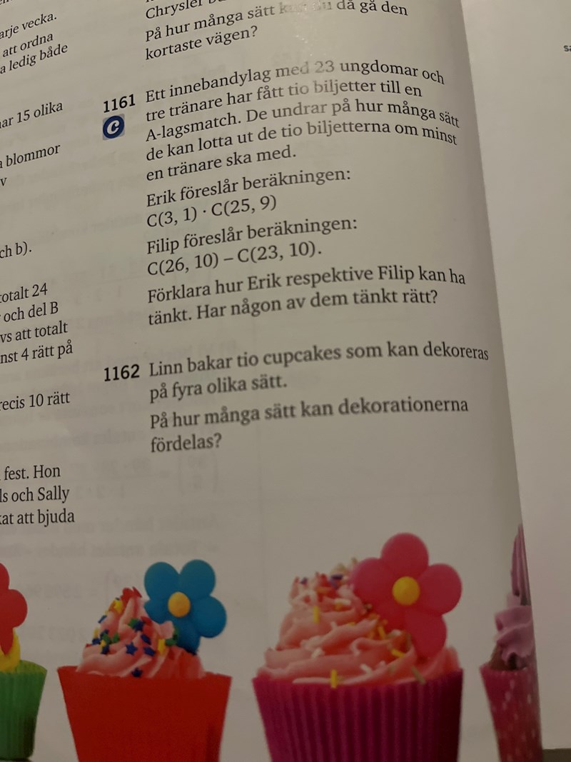 Om alla dekorationer måste användas tar man 9+3=12 eftersom barsen måste placeras mellan två stjärnor. Uträkningen blir då 12 över 3 eller 12 över 9. Sedan om uppgiften skulle gjort det möjligt för vissa cupcakes att inte dekoreras skulle det bli 10+4. Uträkning 14 över 10 eller 14 över 4. Men detta gäller inte för denna uppgift."