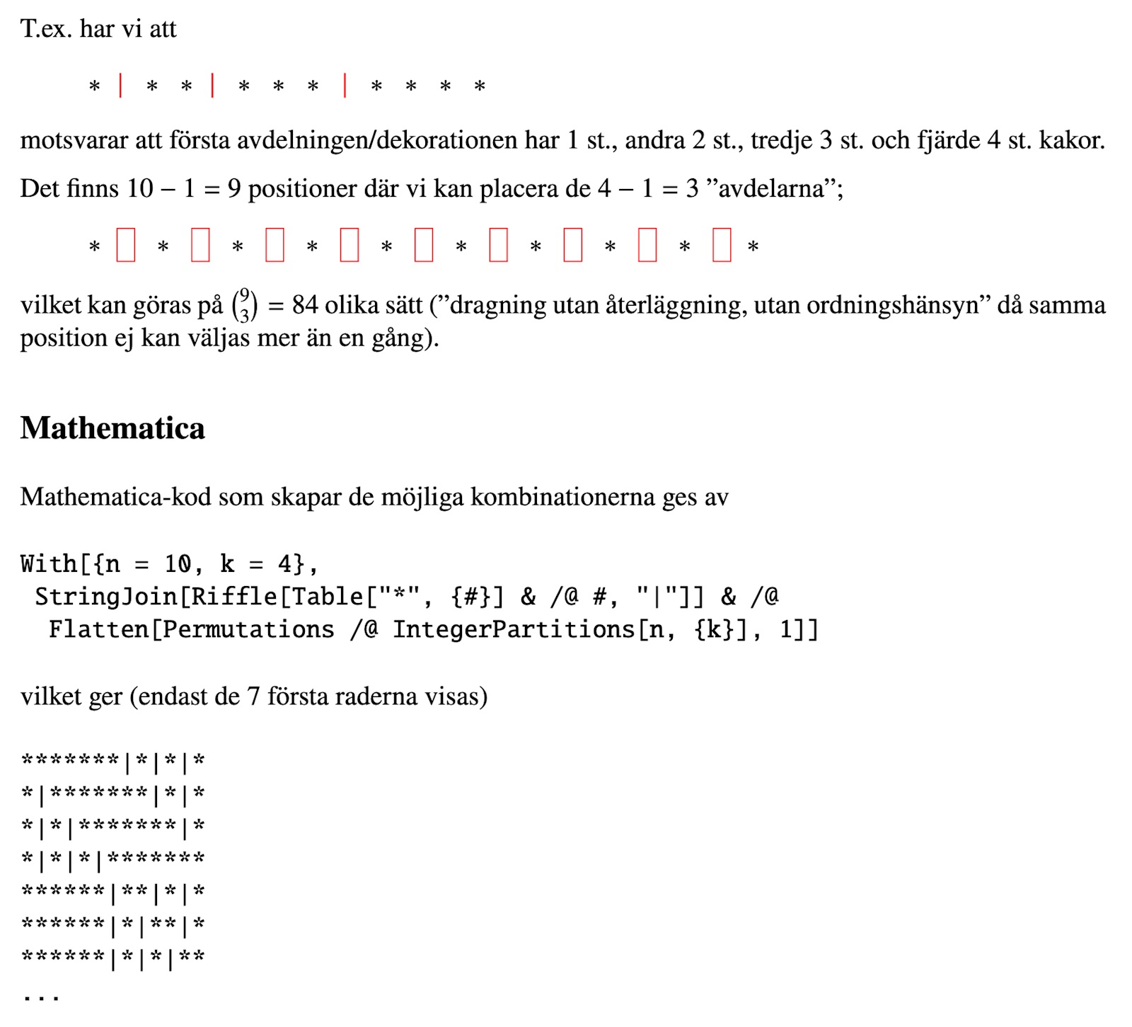 Man kan också tänka att man har tio stjärnor och tre streck (avdelare) som ska ordnas. Det finns (10+3)! sätt att ordna 13 objekt, och eftersom 10 av dem är av samma typ och de andra tre är av en annan typ behöver vi dela med 10! och med 3! för att inte räkna samma sekvenser flera gånger. Vi får