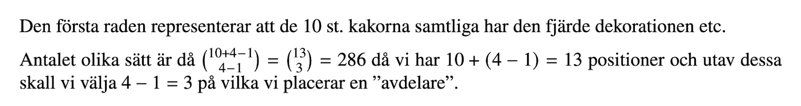 Bra att du poängterar att det kan vara noll bakelser/stjärnor mellan avdelarna. Jag skulle ge pluspoäng om du förklarar tydligt hur ett arrangemang av de 13 objekten motsvarar en unik kombination av dekorationer, gärna genom ett exempel (alltså typ "det som står till vänster om första avdelaren är de bakelser som får dekoration ett, de som står mellan första och andra avdelaren får dekoration två, osv.) samt att du förklarar hur man kan tänka på det på olika sätt (arrangera alla 13 objekten direkt alternativt placera in avdelare mellan 10 objekt som jag beskrev tidigare).