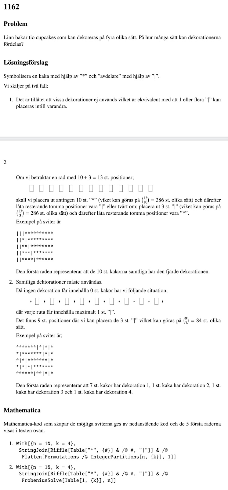 Hejsan266 skrev:Om alla dekorationer måste användas tar man 9+3=12 eftersom barsen måste placeras mellan två stjärnor. Uträkningen blir då 12 över 3 eller 12 över 9. Sedan om uppgiften skulle gjort det möjligt för vissa cupcakes att inte dekoreras skulle det bli 10+4. Uträkning 14 över 10 eller 14 över 4. Men detta gäller inte för denna uppgift."