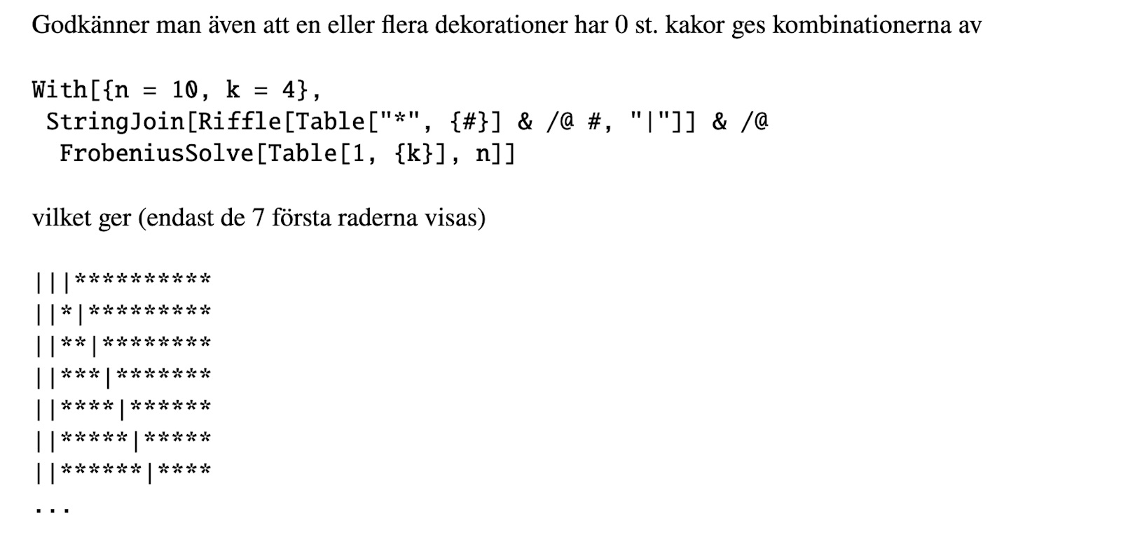 Bra att du poängterar att det kan vara noll bakelser/stjärnor mellan avdelarna. Jag skulle ge pluspoäng om du förklarar tydligt hur ett arrangemang av de 13 objekten motsvarar en unik kombination av dekorationer, gärna genom ett exempel (alltså typ "det som står till vänster om första avdelaren är de bakelser som får dekoration ett, de som står mellan första och andra avdelaren får dekoration två, osv.) samt att du förklarar hur man kan tänka på det på olika sätt (arrangera alla 13 objekten direkt alternativt placera in avdelare mellan 10 objekt som jag beskrev tidigare).
