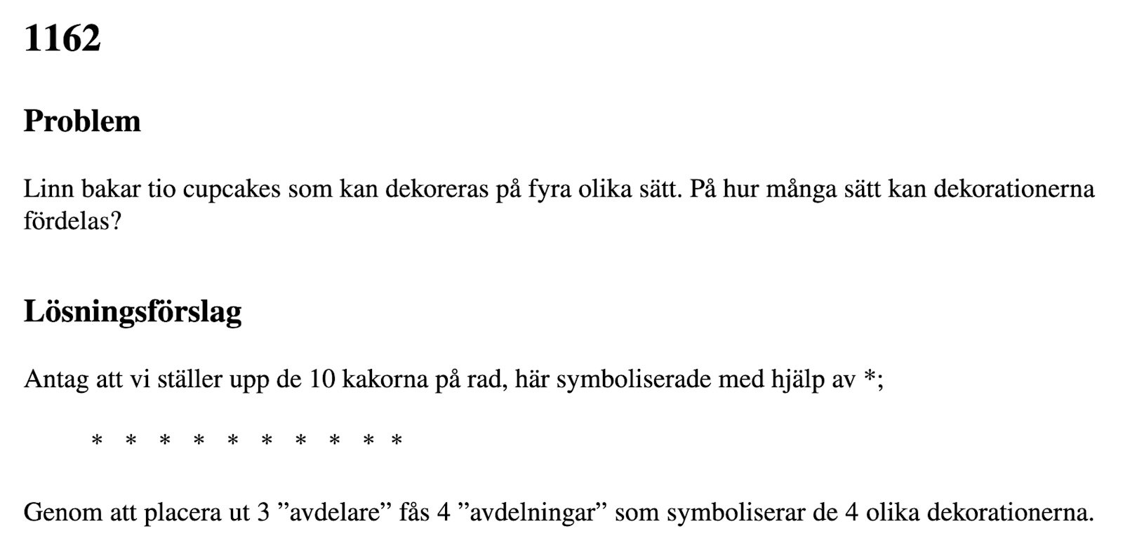 ""Stars and bars" är en bra metod för att räkna ut på hur många sätt man kan dela in saker i olika grupper. I denna uppgift kommer stars att vara cupcakesen och barsen vara det som delar upp dekorationerna. 3 eftersom det ger 4 grupper och 10 stars för att det finns 10 cupcakes. Tillsammans har vi 13 objekt som kan stå i vilken ordning som helst. När vi använder 13 objekt finns möjligheten att vissa dekorationer inte används, eftersom vissa bars inte är positionerade mellan två stjärnor och i andra fall finns två bars mellan samma två stjärnor. För att lösa uppgiften använder vi 13 över 3 eller 13 över 10 för att ta reda på hur många sätt jag kan placera 3 bars alternativt placera 10 stjärnor.