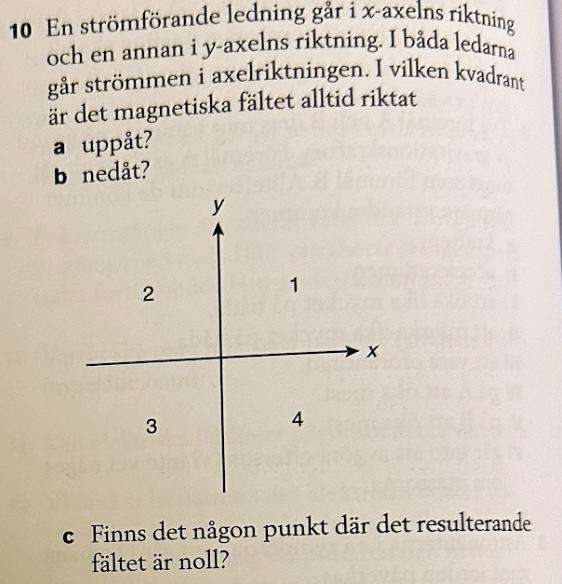 c) Den här är jag faktiskt inte så säker på, kanske där de två ledare korsar varandra? Alltså i origo i grafen. Men förstår inte riktigt hur jag ska resonera kring mitt svar då fältriktningen (spiralerna) är vinkelräta mot varandra.