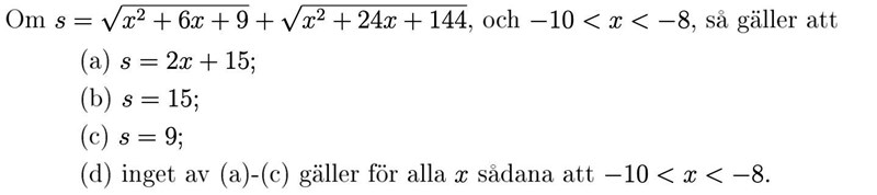 Som du har gjort själv: s=(x+3)2+(x+12)2=x+3+x+12 du vet att -10 < x< -8 och därför blir x+3 < 0 samt att x+12 > 0då får du: s=-(x+3)+(x+12)=-x-3+x+12=9svar: s=9