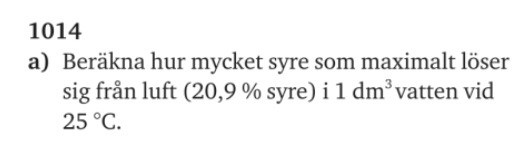 Smaragdalena skrev:Förmodligen är det meningen att du skall använda dig av Henrys lag. Du behöver veta att luften består till 20,9% av syrgas för att kunna beräkna syrgasens partialtryck.