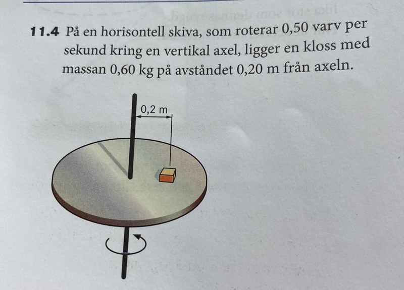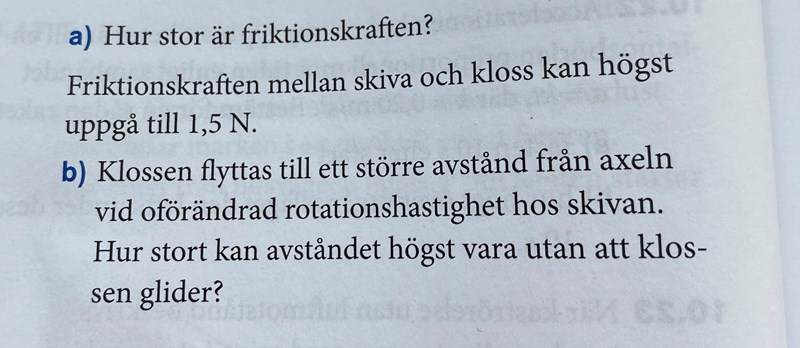 Jag förstår inte hur jag ska lösa uppgift b, jag har försökt men glider in på helt fel bana hela tiden. Hur ska jag gå tillväga för att lösa den? Jag har gjort uppgift a som man nog behöver för att lösa uppgift b. Jag vet att friktionsfriaste mellan skiva och klass kan Max uppgå till 1,5 N.