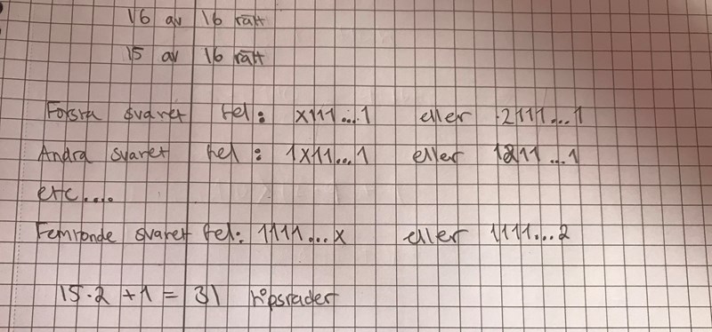 Men det var inte det som efterfrågades, det var antal rader med exakt 15 rätt. Det finns 16 sådana rader (eftersom felet kan vara på 16 olika positioner) och varje sådan rad kan vara fel på 2 olika sätt, därav 16*2.
