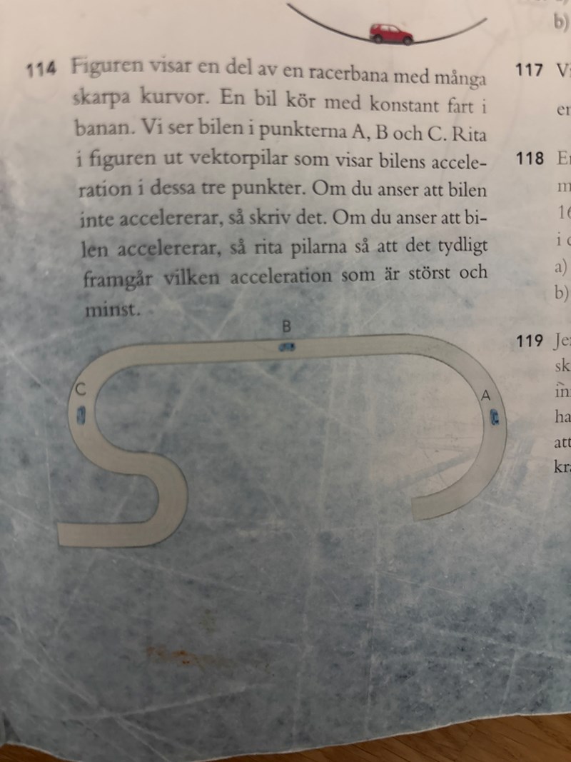 Vid B är det en raksträcka. Bilen svänger inte. Vid A och C är det en kurva, bilen svänger.