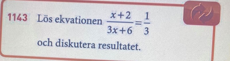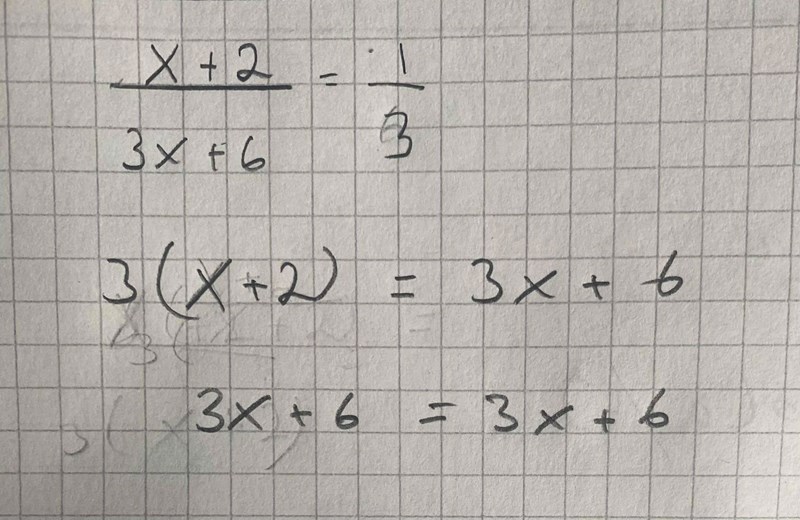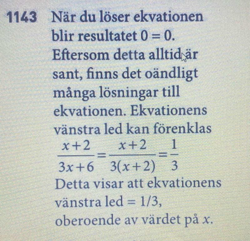 Facit säger att det finns oändligt med lösningar eftersom VLförenklas till 1/3. Det spelar alltså ingen roll vad x är eftersom HL och VL inte är beroende på x. Tänk om du hade haft 2x/x som förenklas till 2, det blir 2 oavsett x eftersom x är en gemensam faktor så den går alltid att stryka.