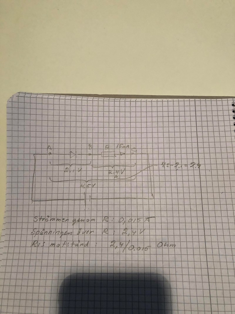 Antag motståndet är R ohm. Spänningen över dioden och R tillsammans ska bli 4,5 volt. Eftersom spänningen över dioden är 2,1 V, måste spänningen över R vara 4,5 - 2,1 V