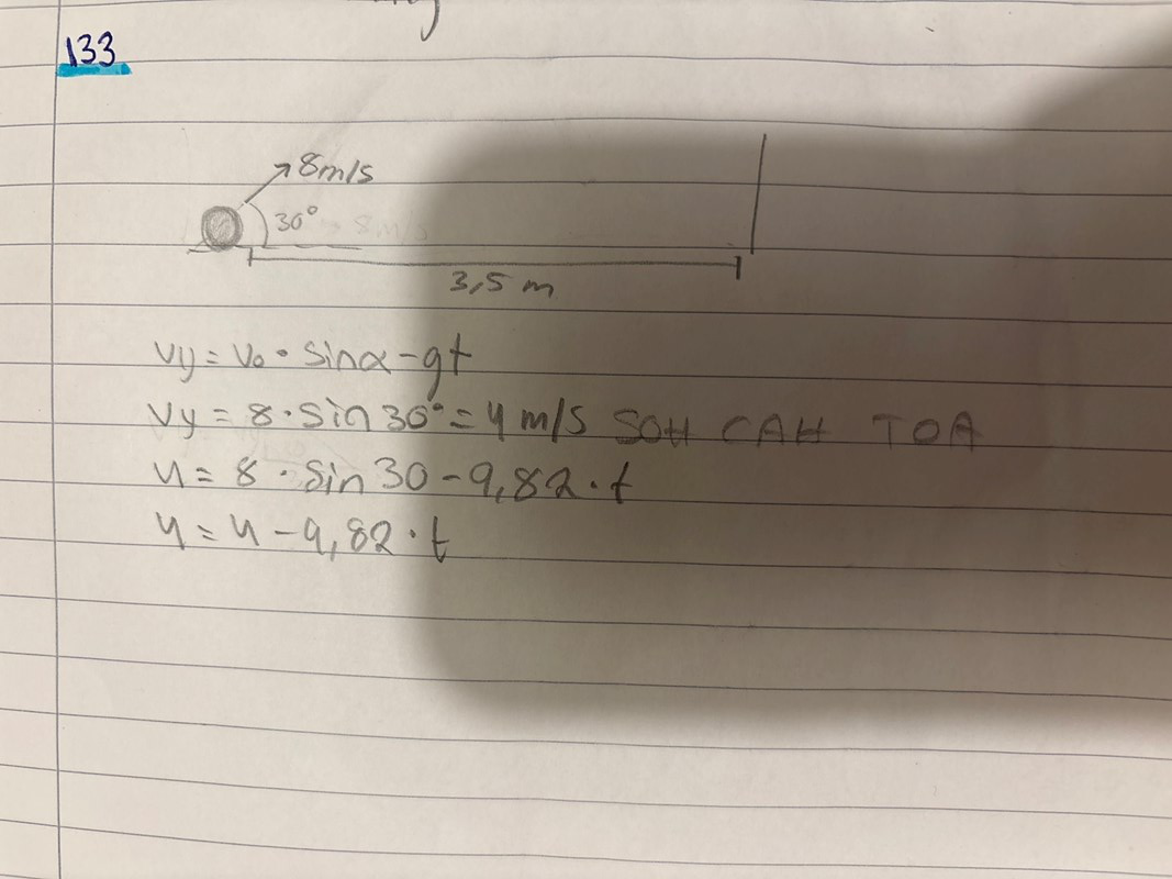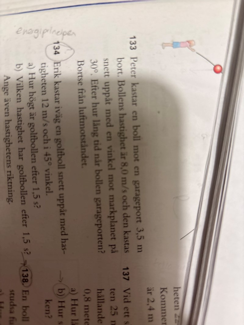 Jag förstår inte riktigt men det ser ut som att du försöker räkna ut lodrätt hastigheten. När bollen rör vägen är den lodrätta hastigheten inte lika med 0 för att gravitation har fortfarande påverkan på bollen och det står inte att den rör marken när den kommer i kontakt mot vägen. Slutligen står det inte heller att maximala höjden är nåt när den kommer i kontakt mot vägen.