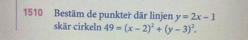 Jag har fastnat på denna uppgift, förstår att radien är 7 och att medelpunkten är (2,3) men sedan förstår jag inte riktigt hur jag ska bestämma de punkter där linjen skär cirkeln