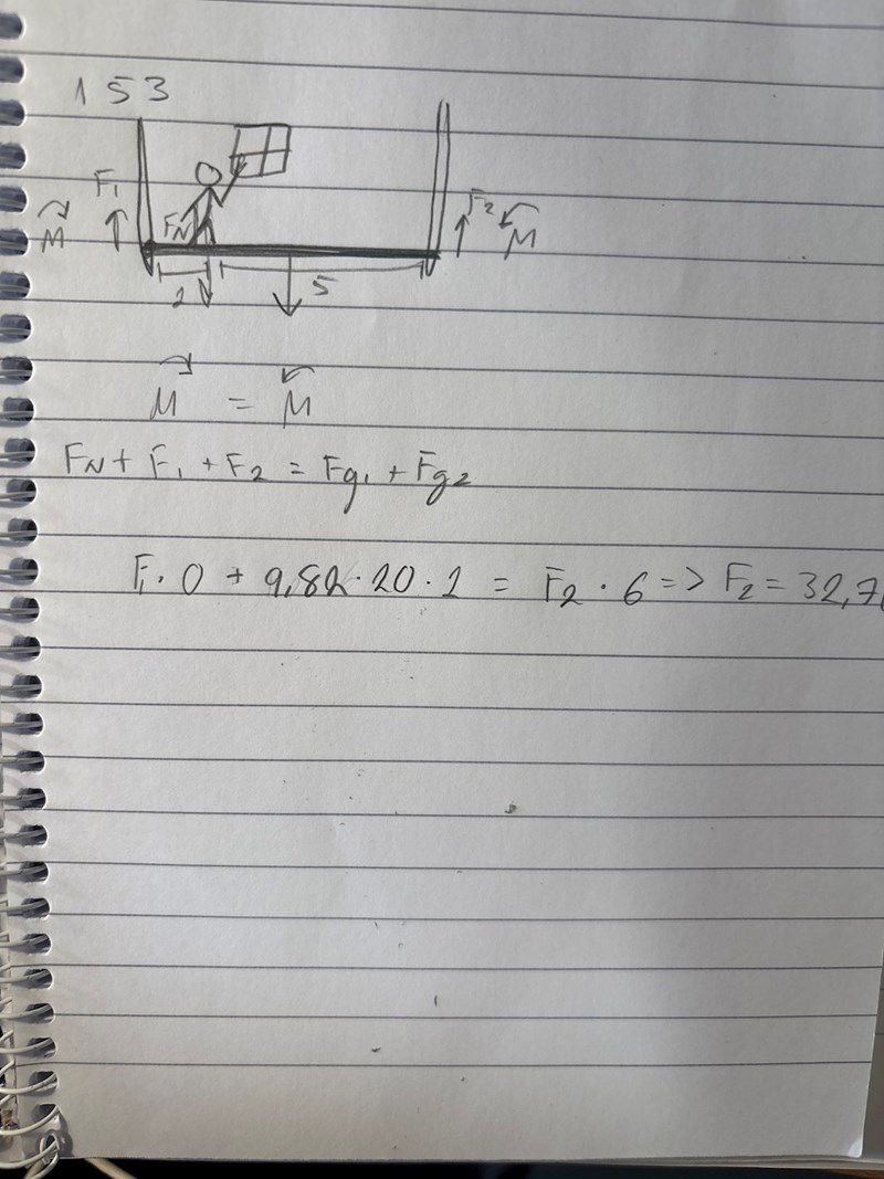 Om vi tar momentjämvikt i vänstra änden på brädan så har vi tre krafter som ger ett moment runt den punkten, jag ser bara två. Sen väger fönsterputsaren 60kg inte 20kg