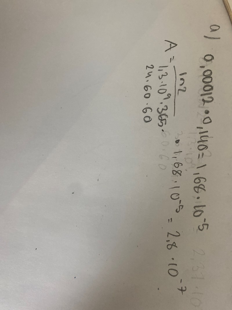 Vad är det för uppställning du gjort? Den är inte lätt att följa, särskilt inte utan enheter. Det blir svårt att följa och enheter är jättebra som kontroll. Fråga (a) rör aktivitet, så jag gissar svaret skall vara i becquerel (Bq) (sönderfall per sekund). Får man inte ihop rätt enhet, så har man helt enkelt inte räknat på rätt sätt.