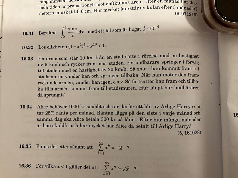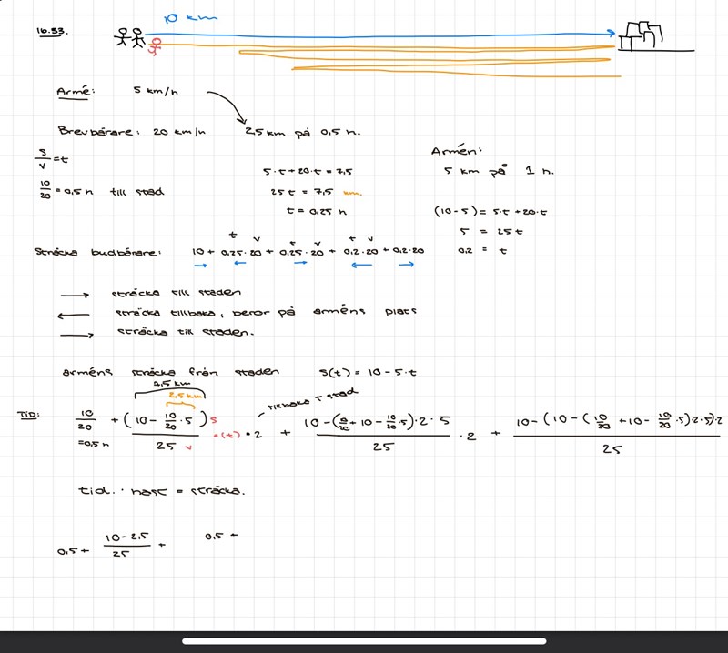 - Armén går mot staden och är framme efter 2 timmar. Brevbäraren kommer att springa i två timmar, vilket ger att han totalt sprungit 40 km (Vilket förvisso är rätt svar, men jag vill gärna reda ut hur jag kan ställa upp den som en geometrisk summa som går mot oändligheten).