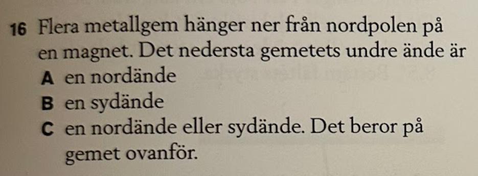 Jag resonerar så här: Om man skulle ha endast ett gem så skulle det skapas en tillfällig sydpol hos en övre änden av gemen (änden som är närmast nordpolen på magneten), alltså skulle den undre änden vara en nordände. Detta skulle upprepas för varje gem, alltså skulle den under ände på varje gem vara en nordände.