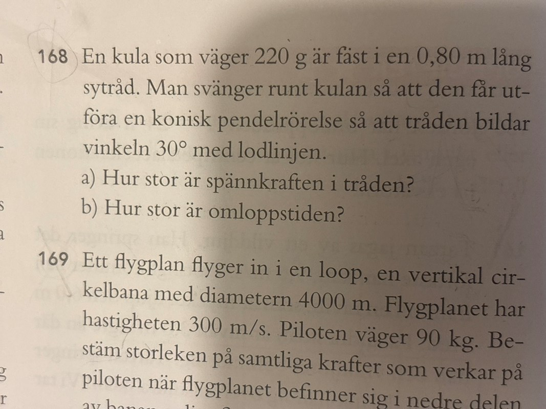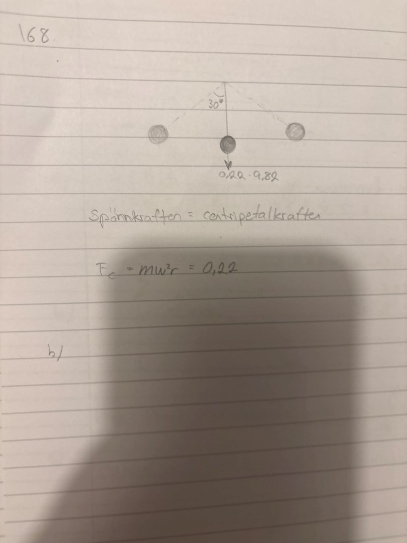 Hej! Jag känner inte igen den här typen av uppgifter för mekanik. Jag misstänker att jag ska använda centripetalkraften, men hur går jag vinkelhastigheten när jag inte vet tidsenheten?