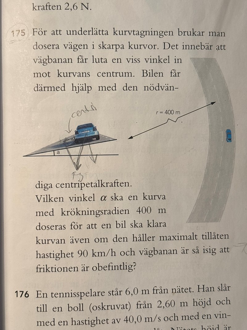 Hej! Jag tänker att tyngdkraftens horisontella komposant måste vara centripetalkraften, men hur vet jag vilken vinkel i min inritade triangel som är samma som A i lutningen på vägen? Om jag vet det kan jag lösa uppgiften mha trigonometri