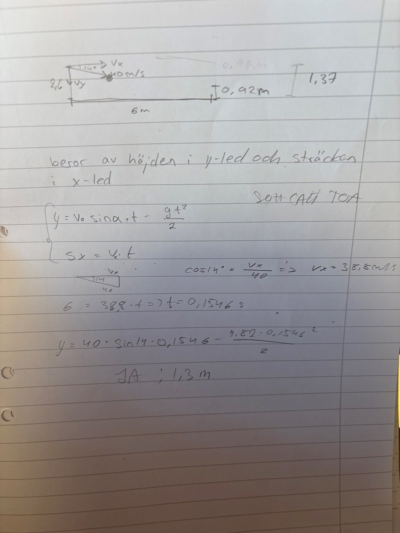- Om du lägger x-axeln i markhöjd så är ursprungshöjden y0 = 2,6 meter och du ska ta reda på om y är större än eller mindre än 0,92 meter när bollen når nätet.